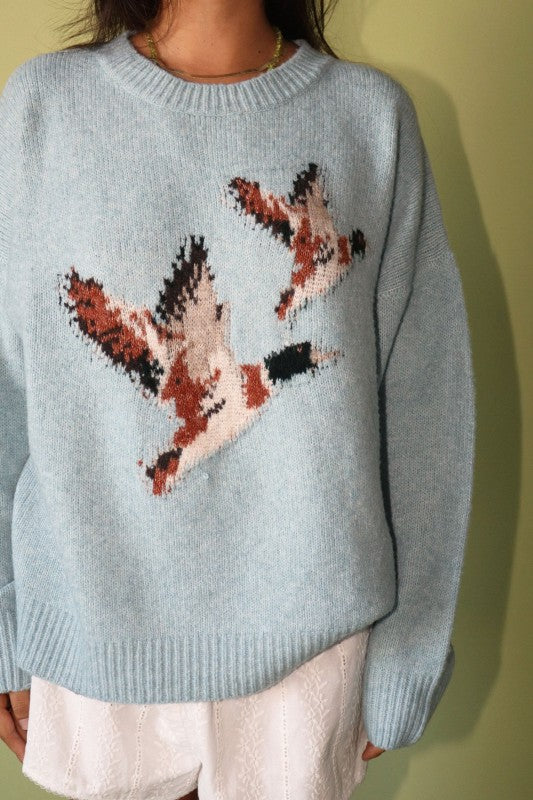 Dusty blue colored oversized sweater with mallard flying duck design on front.