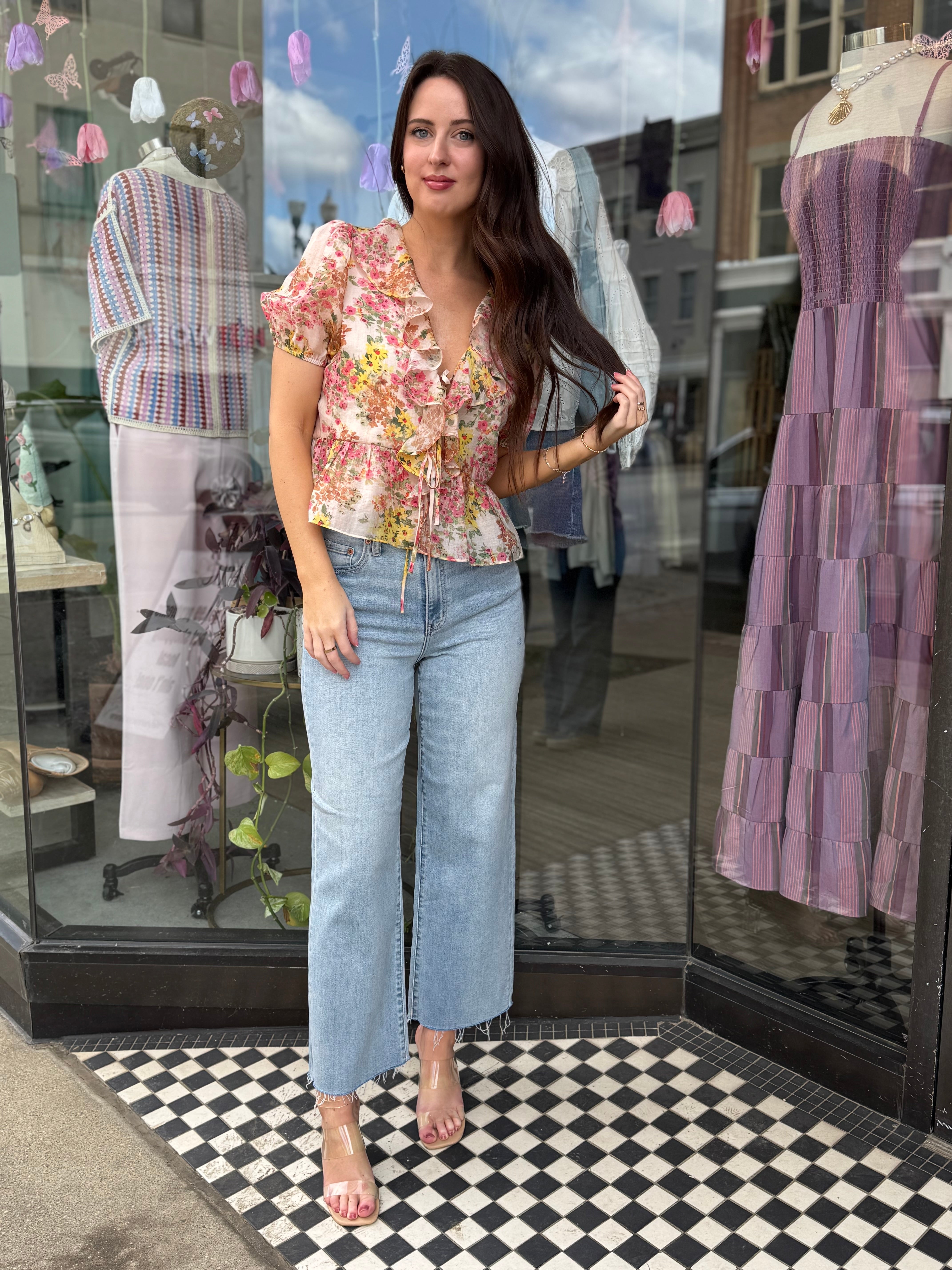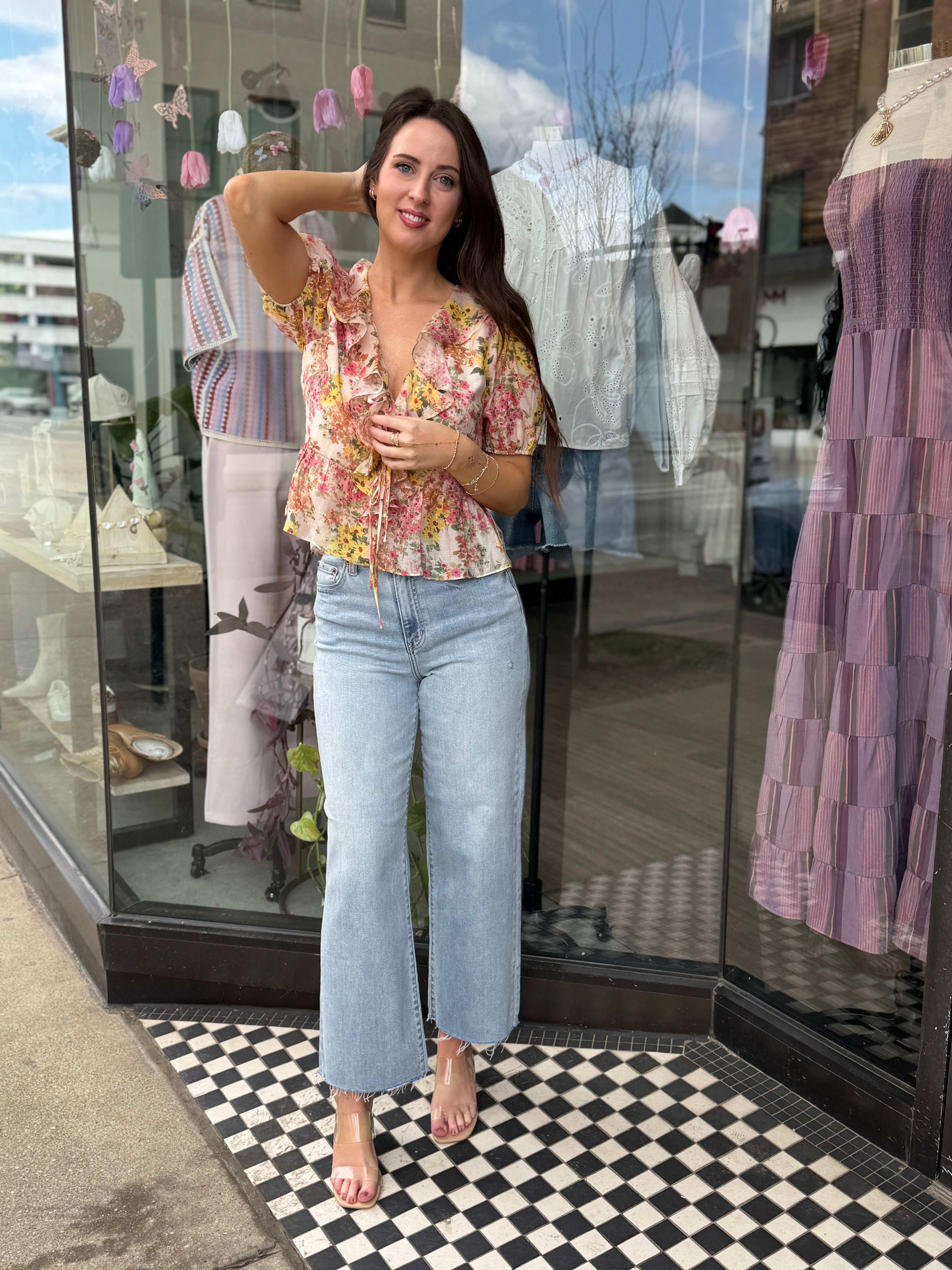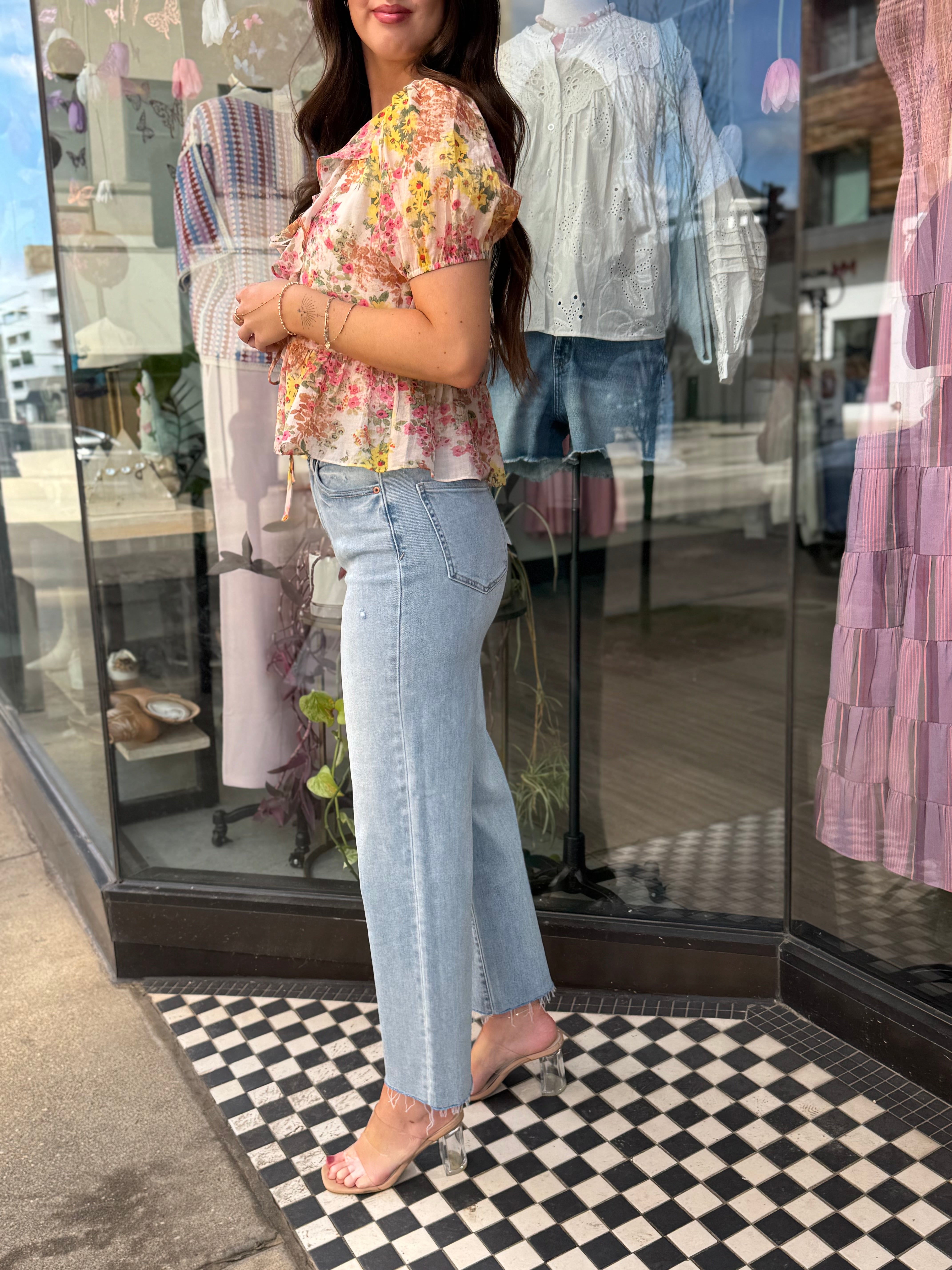 This jean aims to please. In an easy wide leg with a scissor cut hem, this waist defining high rise features fading and a light wash with highs and lows. Constructed in our Hug denim, has form flattering stretch while still keeping the vintage inspired wide leg fit.