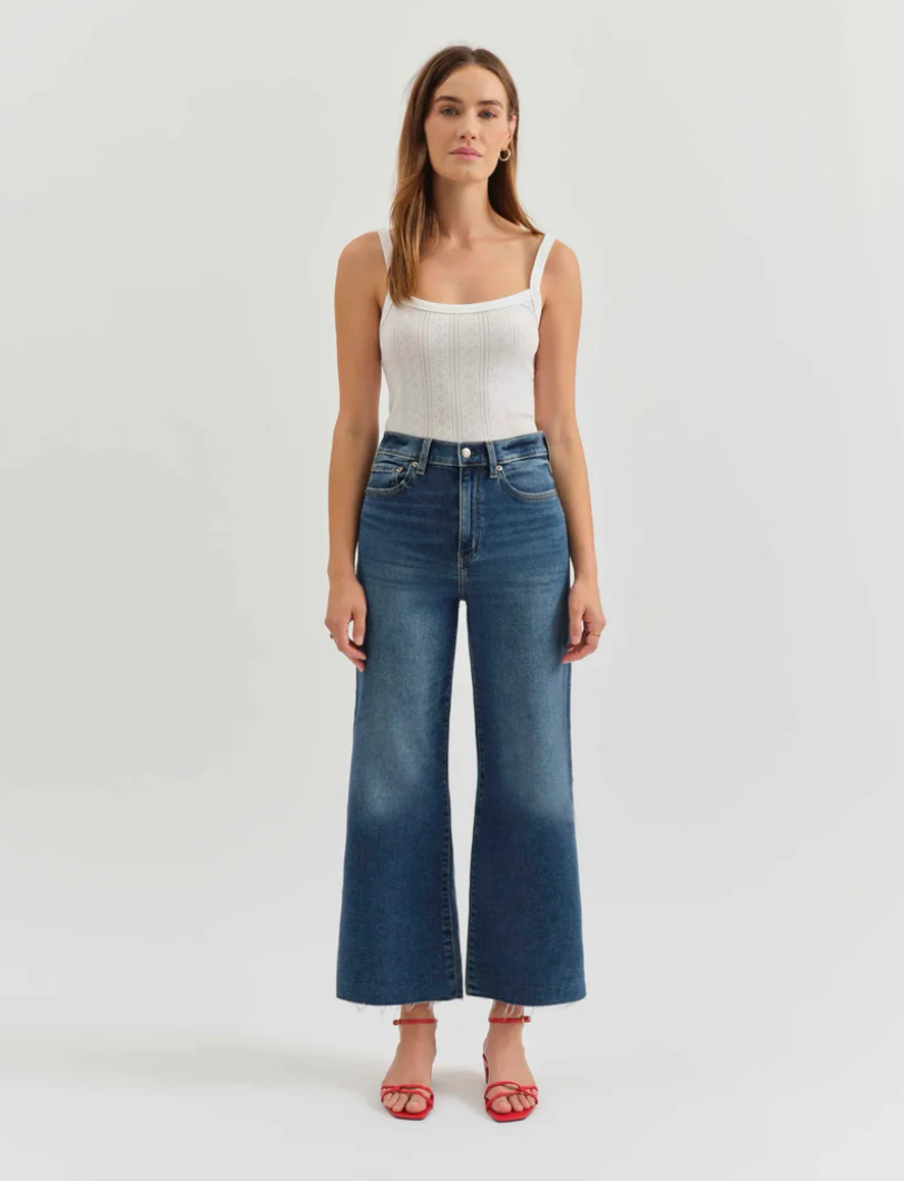 The Pleaser is Daze's tried and true high rise wide ankle, featuring seaming details at the waist against an indigo blue wash with slight fading. This fit is constructed from Daze's Hug denim, which is flexible enough to hug your body, yet heavy enough to cinch you in.