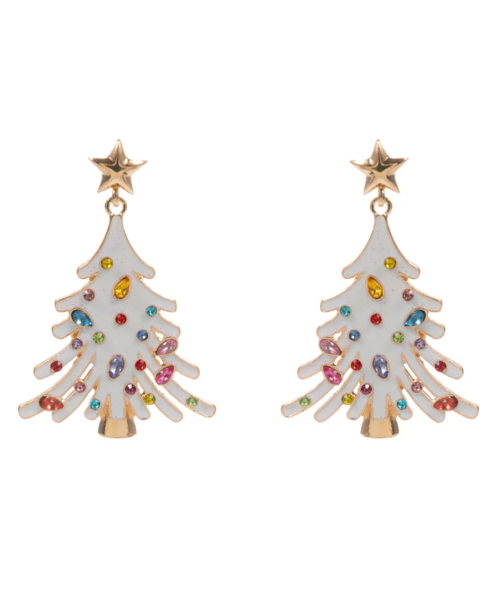 2 inch white enamel christmas tree earrings with multicolored rhinestones
