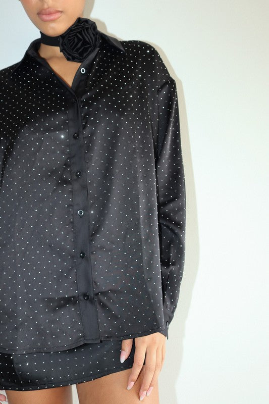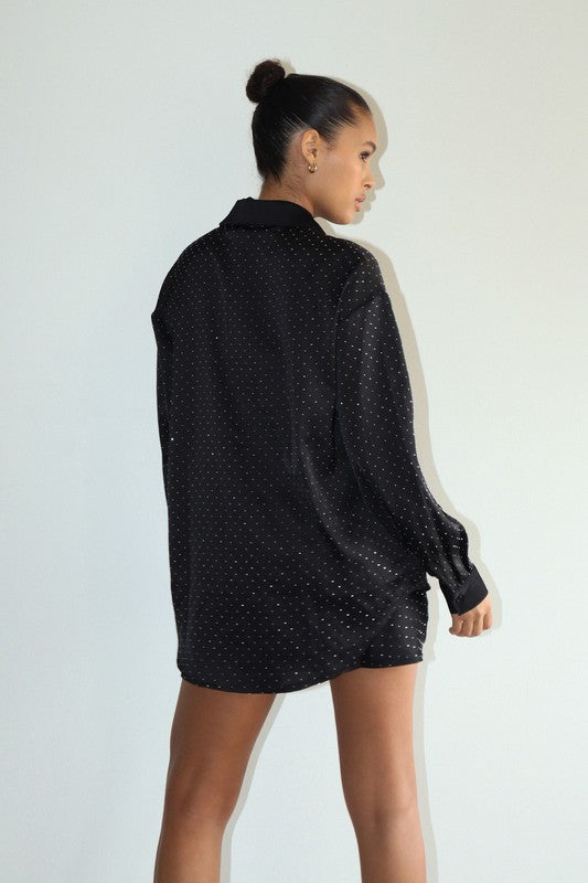 Oversized satin blouse with rhinestone studs allover. Perfect for any party or special event like a concert!