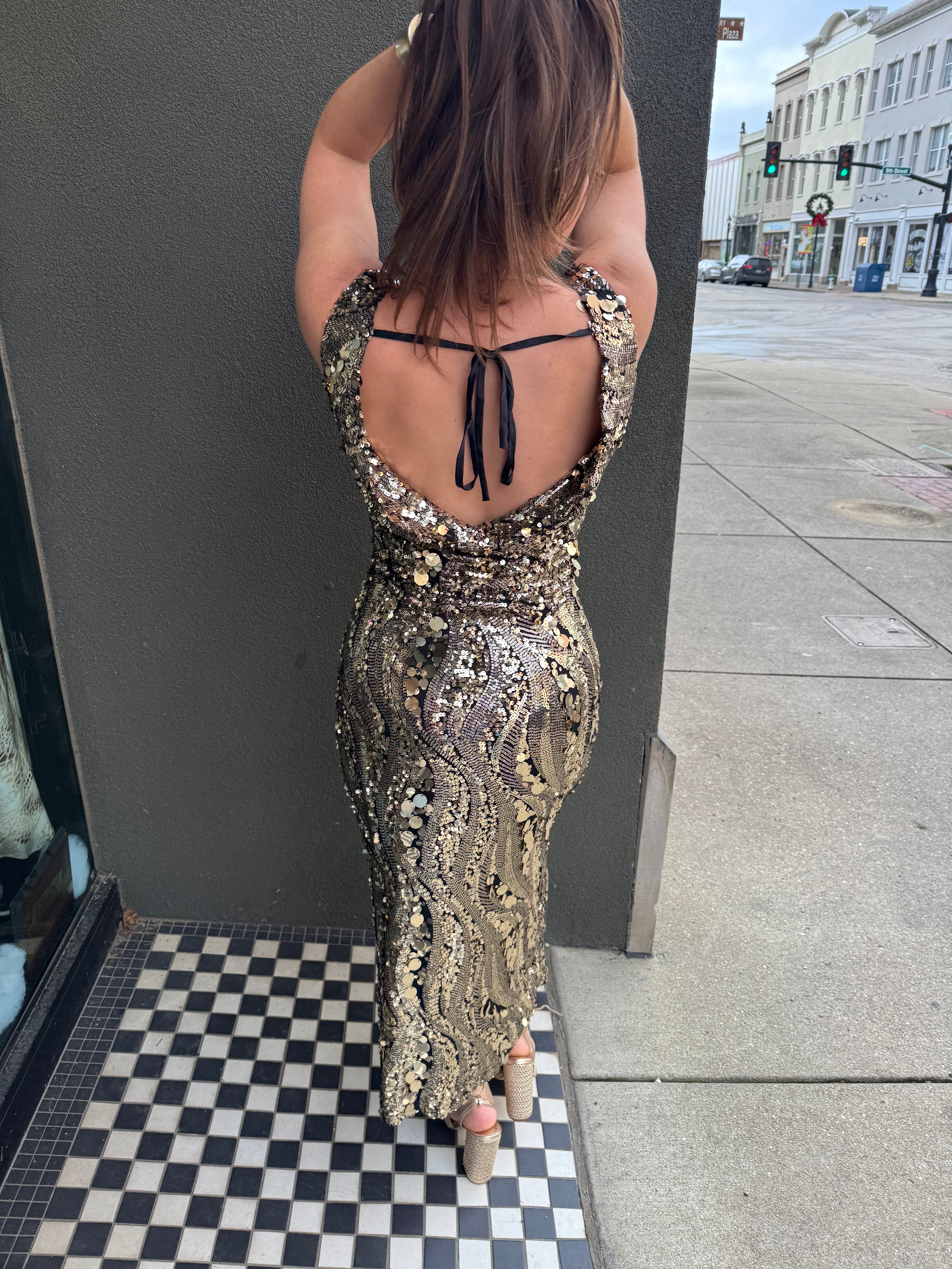 Long midi length gold sequins with black underlay dress. V-neckline with thick straps and open cowl back featuring a tie closure. Standout in the crowd and be the "Golden Vision" everywhere you go! Perfect for the Holidays, party, birthday, or other special events!