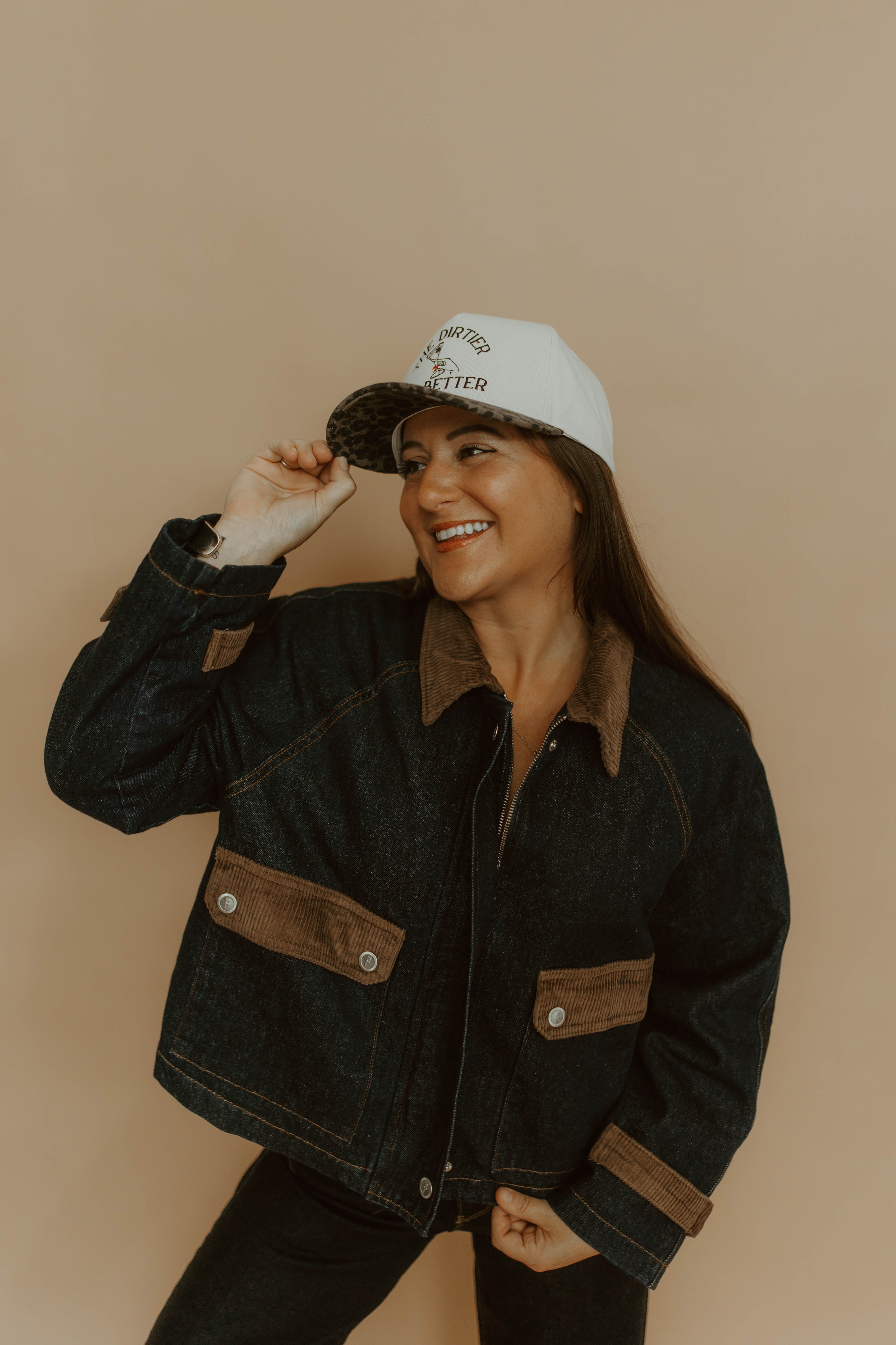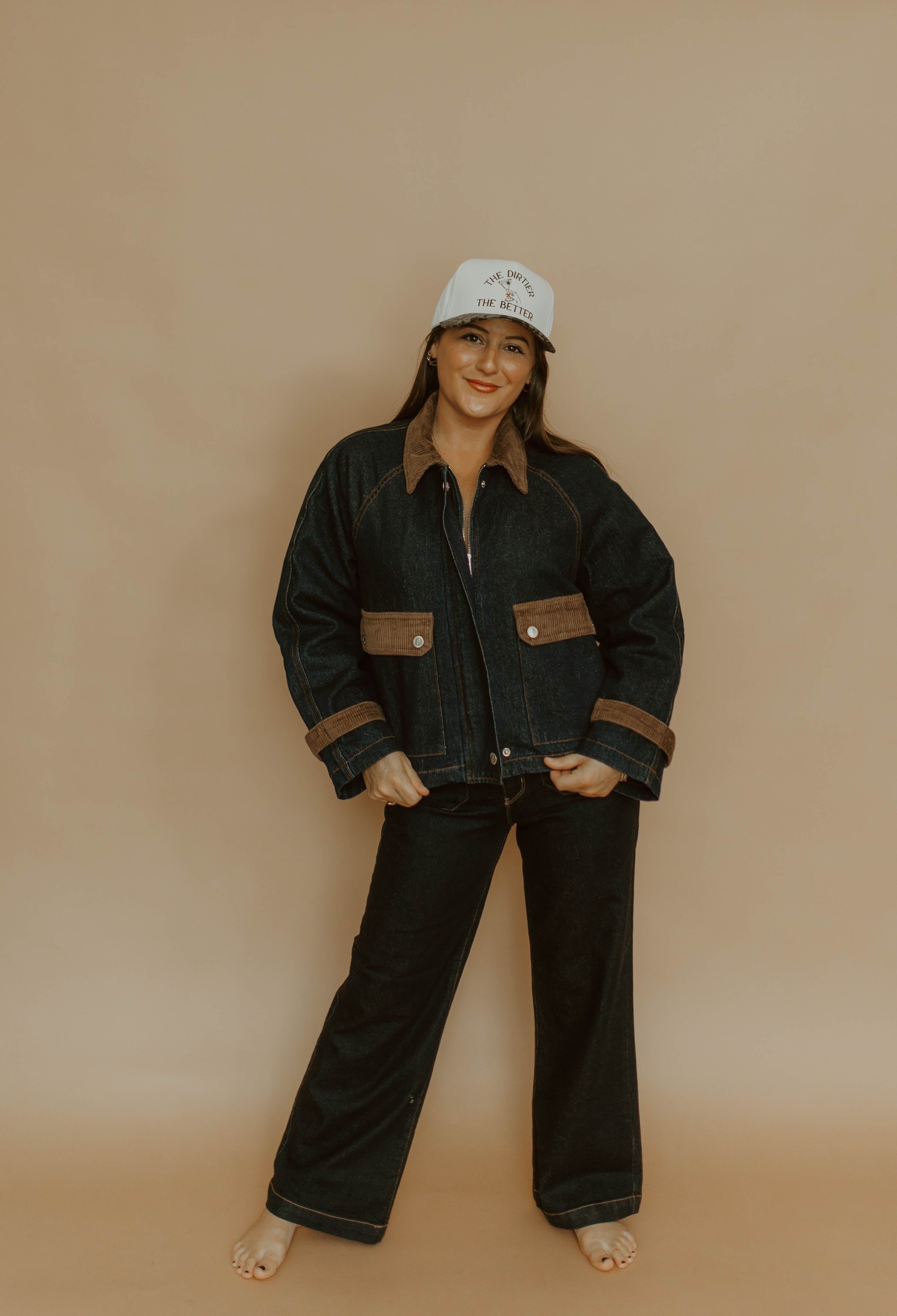 An edgy and cool deep blue denim jacket with brown corduroy details. Inside is quilted to keep you warm on those chilly nights!