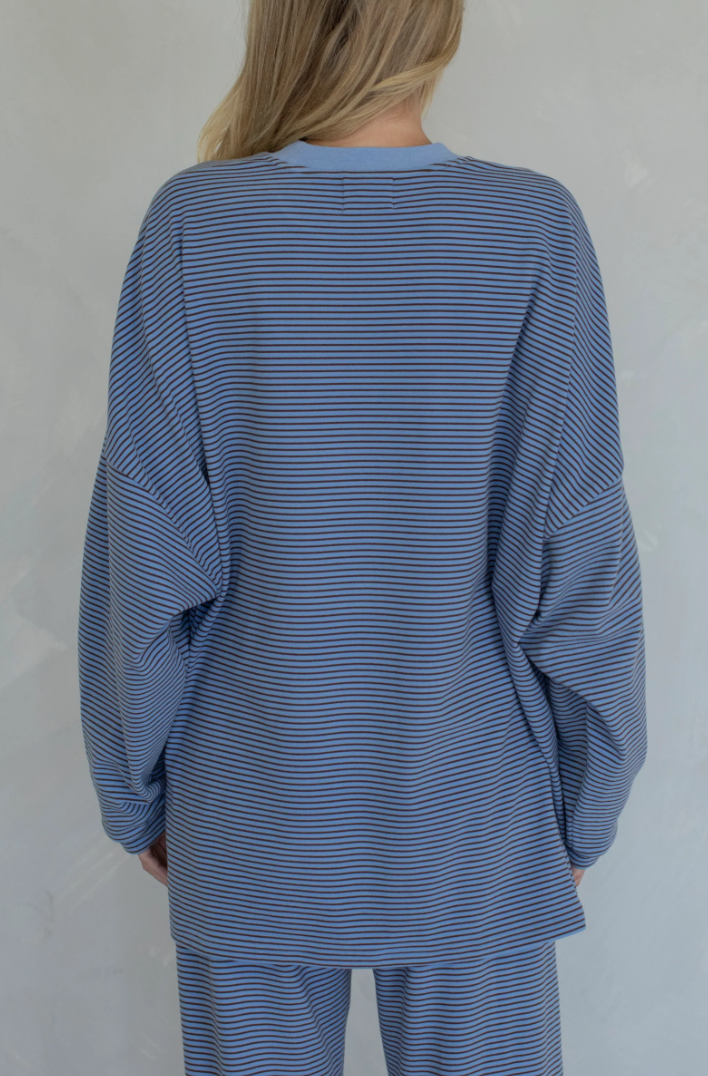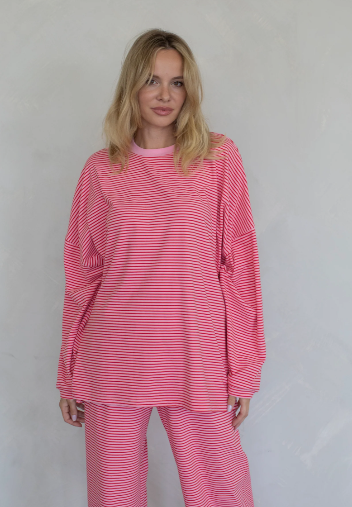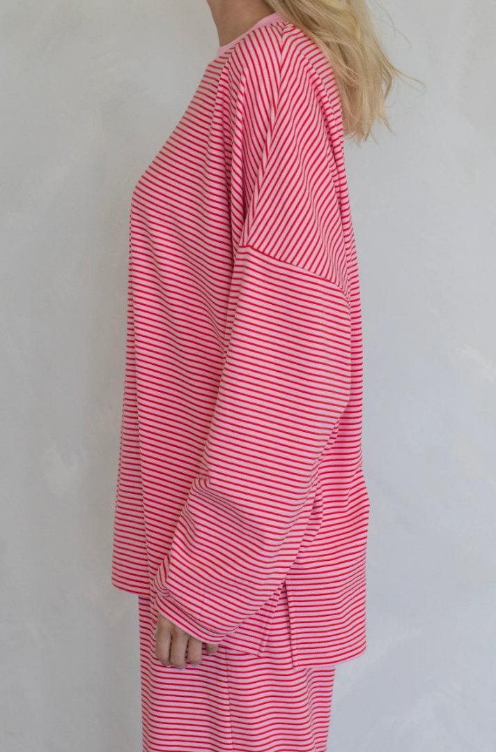 Deliciously cozy light-weight fleece top perfect for travel days!! Striped with ribbed cuff sleeves. Has matching lounge pants to wear as a set! Pink/Red striped. Blue/Brown striped