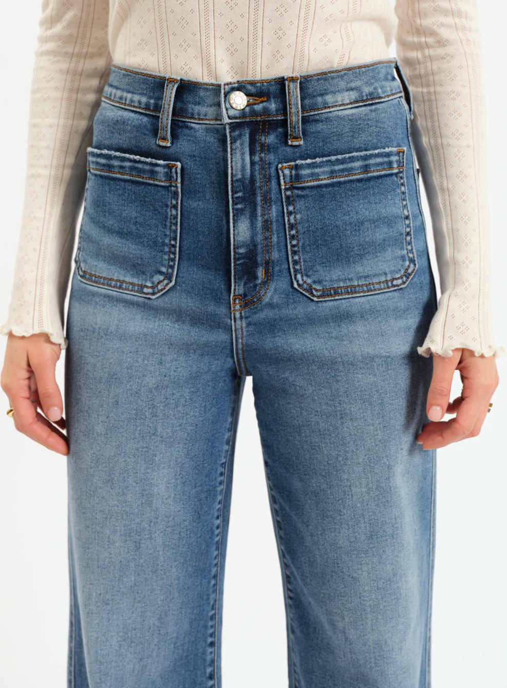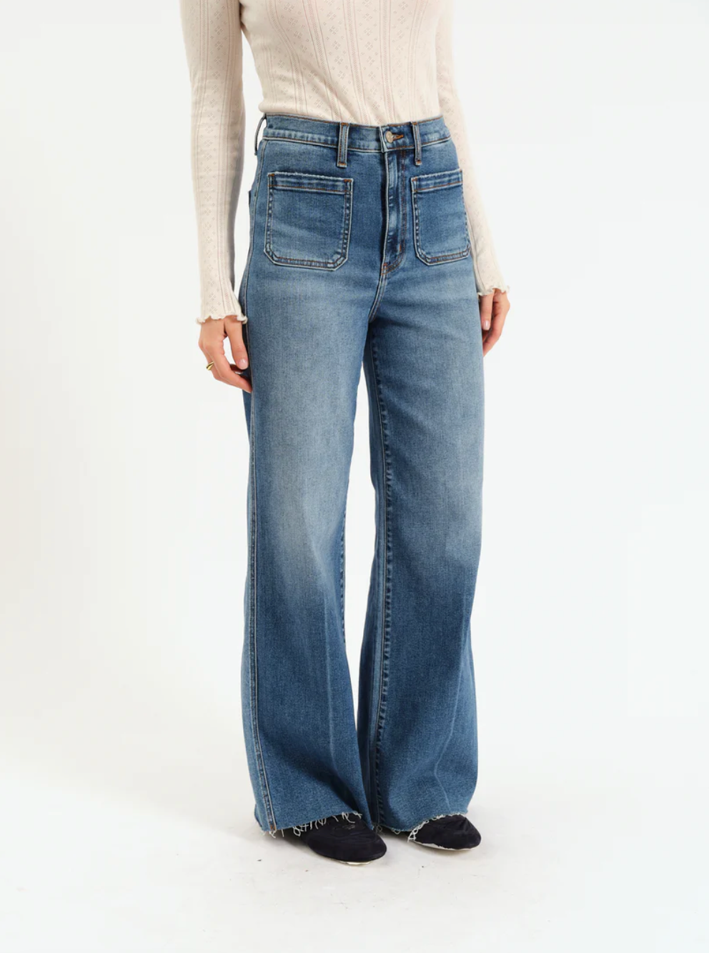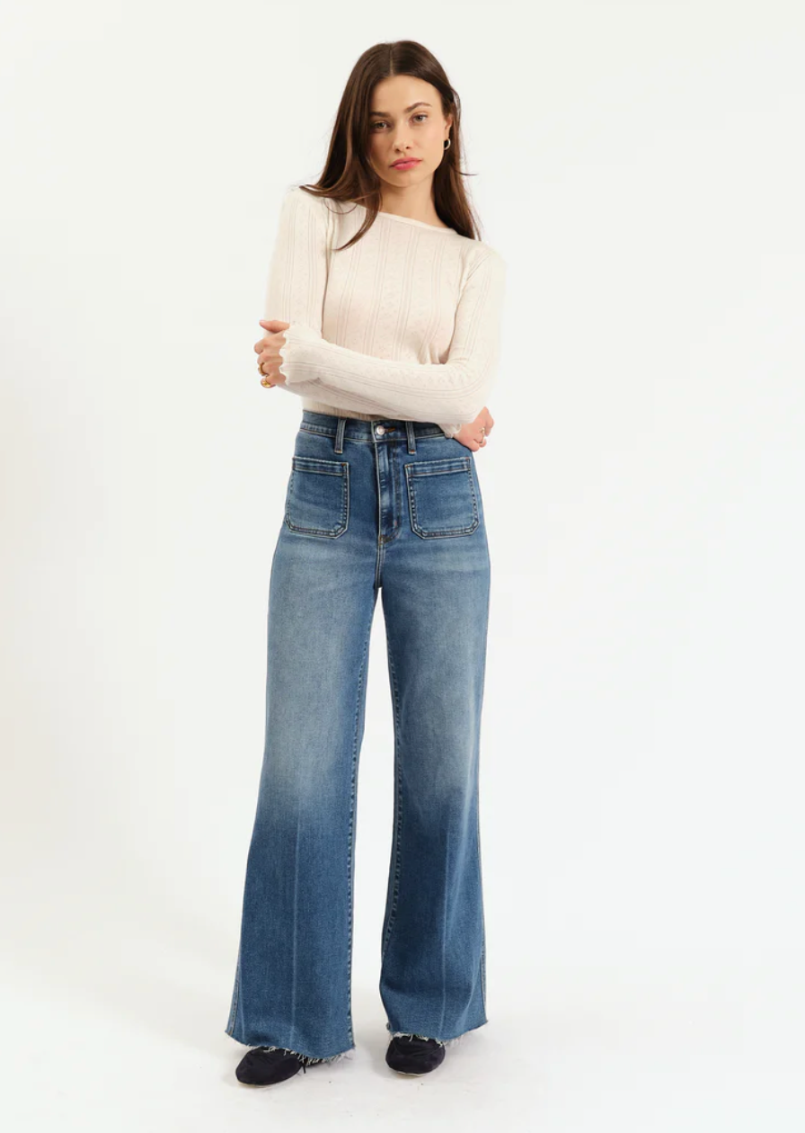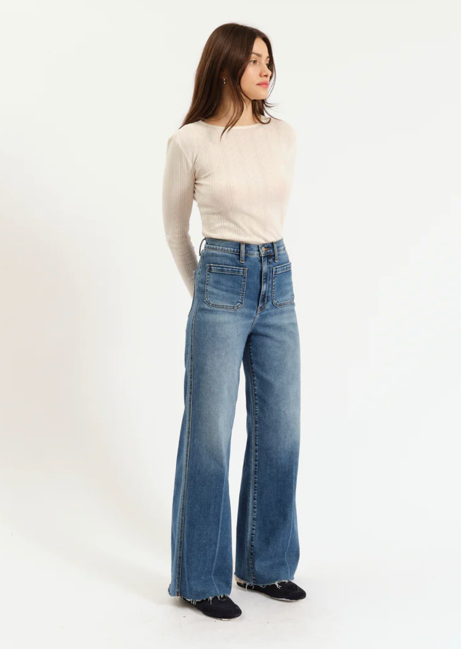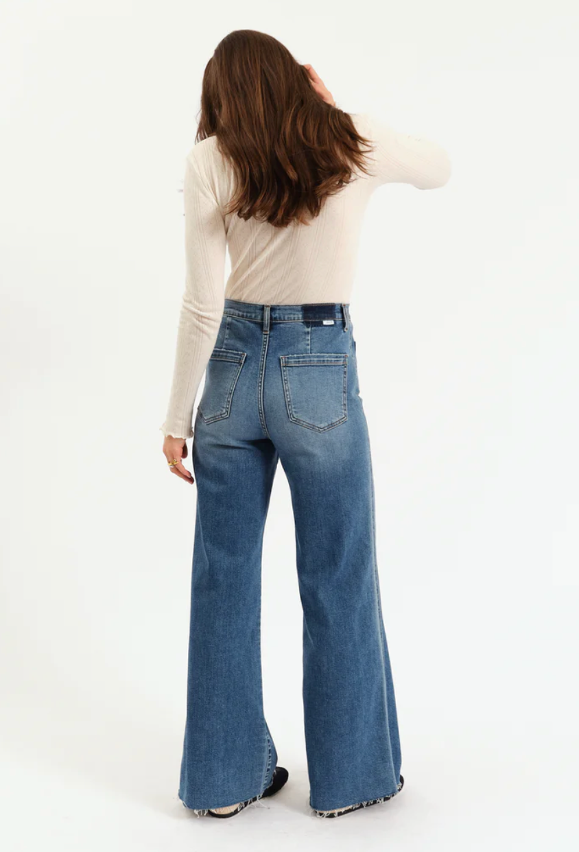 The cool girl jean, Far Out is a modern silhouette with twisted seams across the fit to give the appearance of longer legs. In a waist defining high rise, this wide leg is constructed in Daze's "hug" denim that hugs your body, but has just enough weight to keep a structured fit.