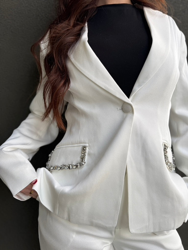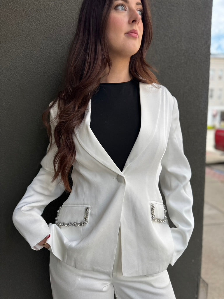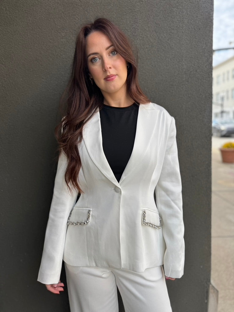 Traditional white blazer with crystal rhinestones on pockets. Fabric has a slight sheen to it, fully lined. Single breasted, smaller shoulder pads, and buttons along sleeves. Pair with the matching Dazzling Trousers for a power suit.