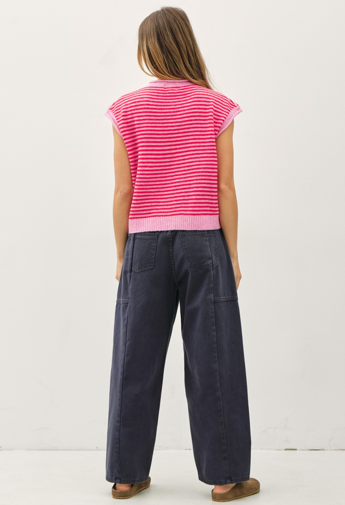 Your all-time favorite now in the cutest striped variations! This vest is slightly oversized and cozy featuring full-length buttons, rolled hems, and a drop cut shoulder. Pair with our So Soft Ribbed Turtleneck for an extra cozy layered look!