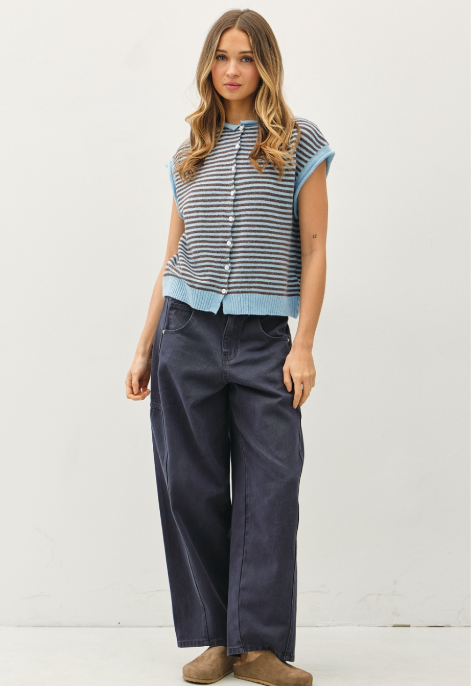 Your all-time favorite now in the cutest striped variations! This vest is slightly oversized and cozy featuring full-length buttons, rolled hems, and a drop cut shoulder. Pair with our So Soft Ribbed Turtleneck for an extra cozy layered look!