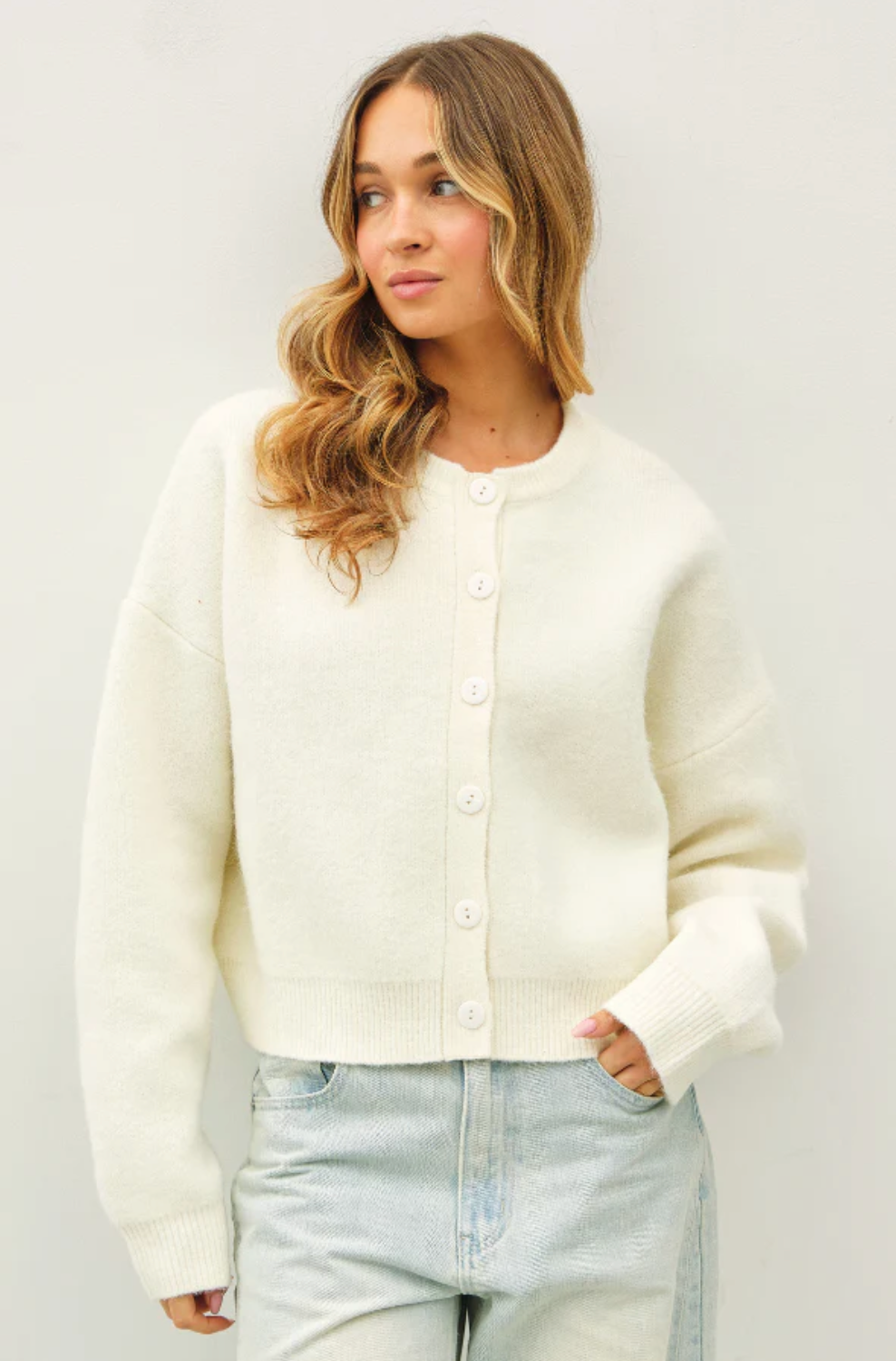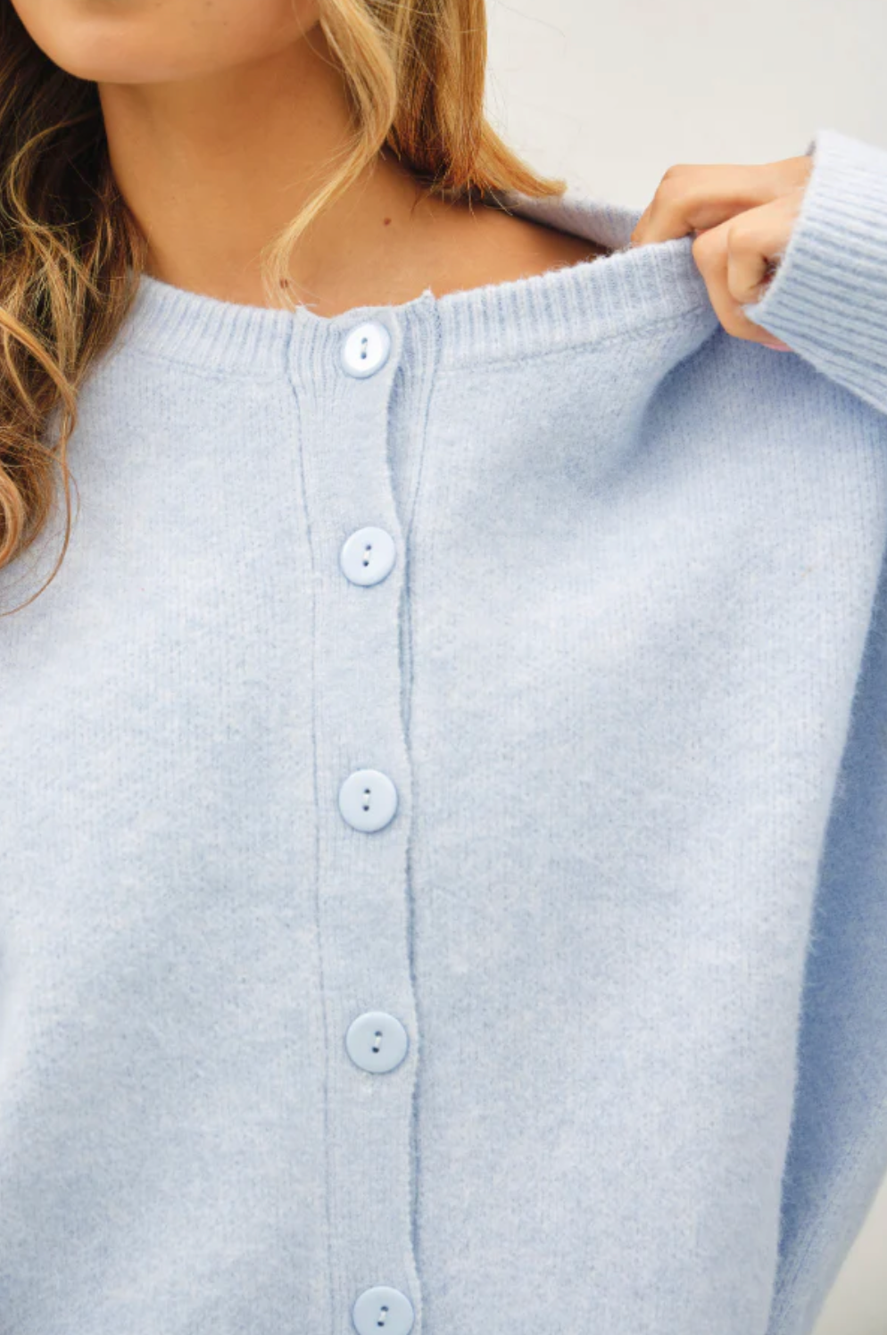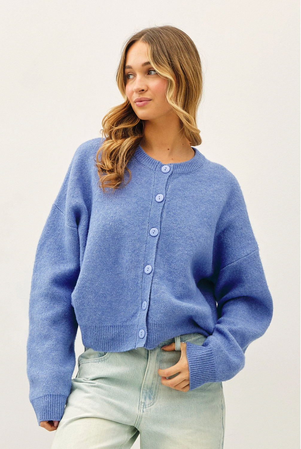 Oversized knitted cardigan with long sleeves and monochromatic large buttons. Super casual and cozy for your everyday life!