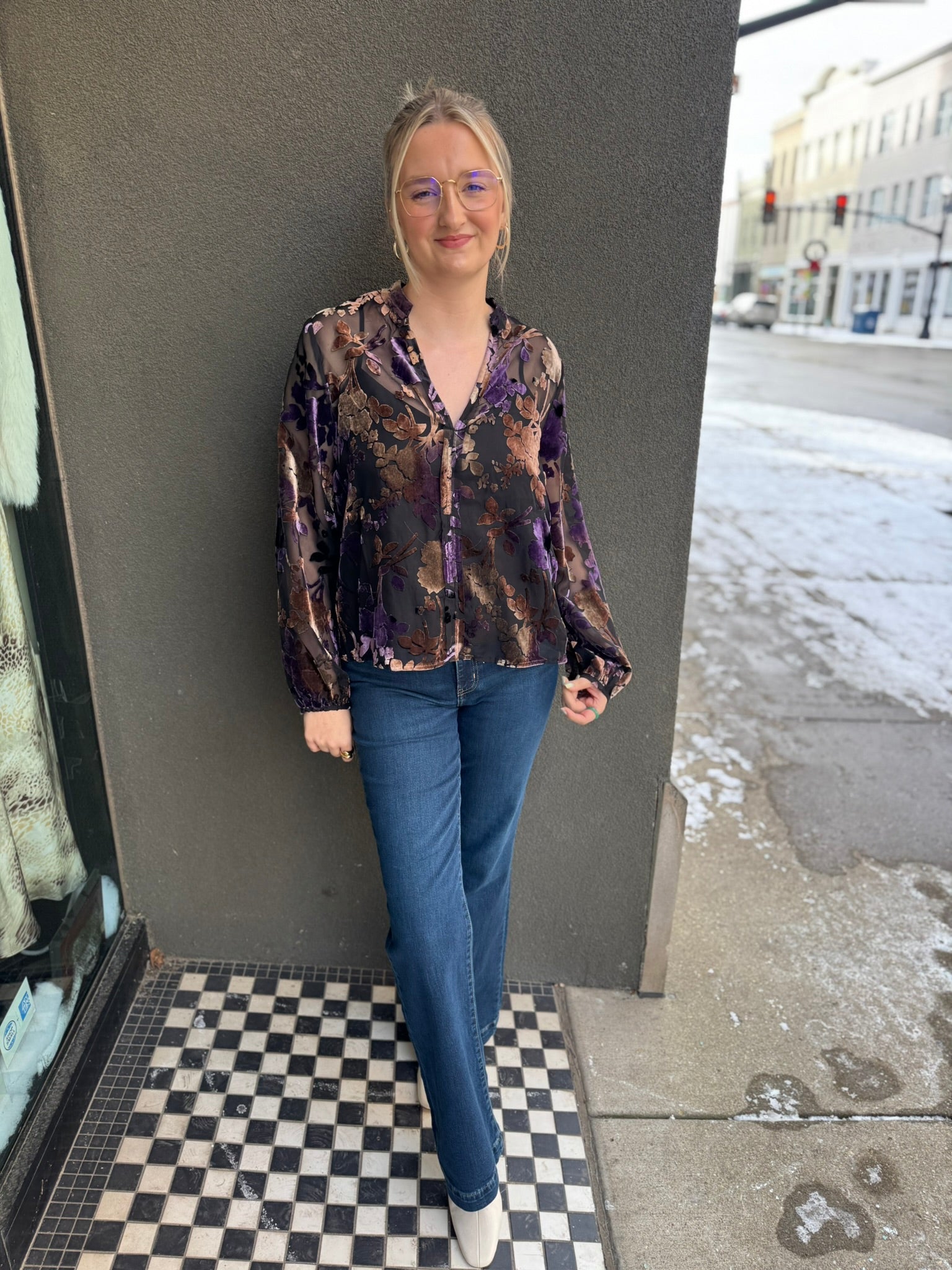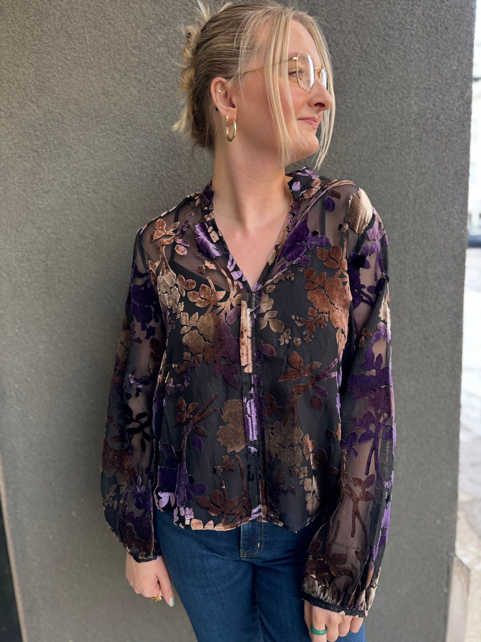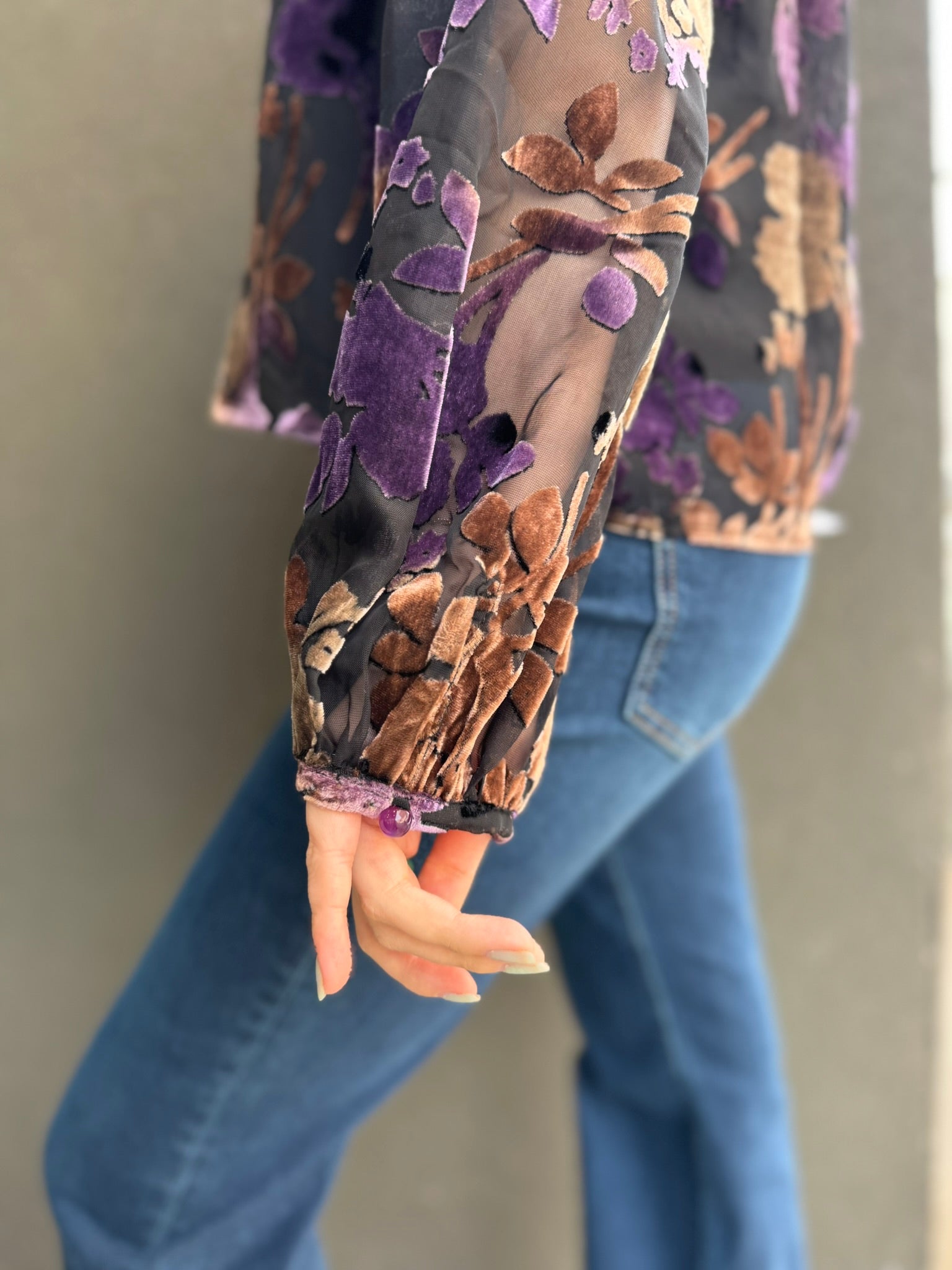Black, brown, and purple sheer burnout velvet top with a v-neckline and billowed sleeves. Comes with simple black tank to wear underneath