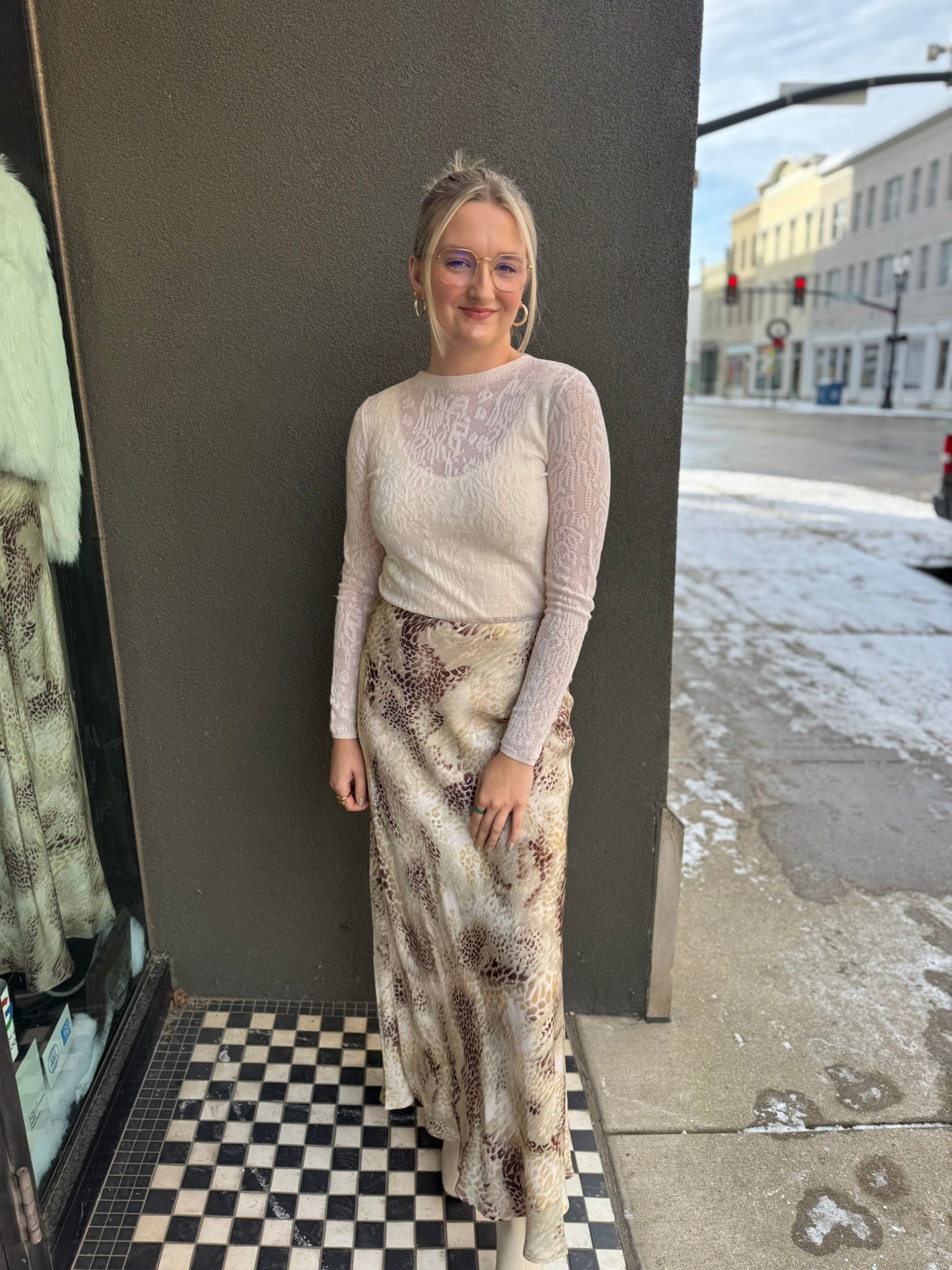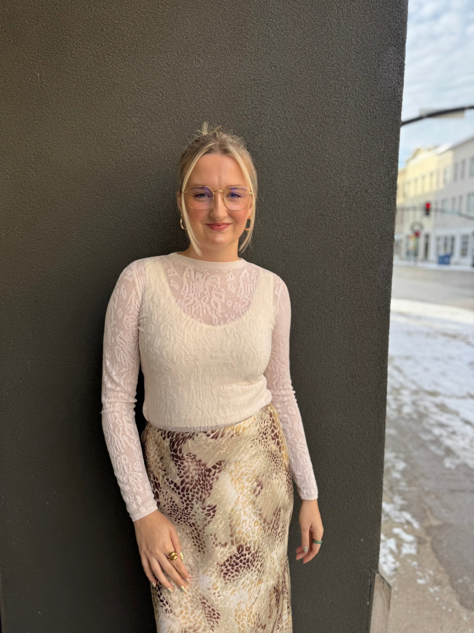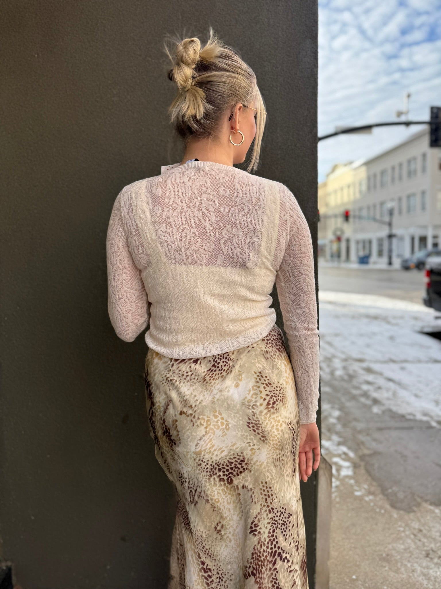 Long sleeve sheer stretchy lace top. Perfect for layering underneath your favorite sweater vest or wearing alone for a standout moment. Cream Nikibiki layered underneath in photos.