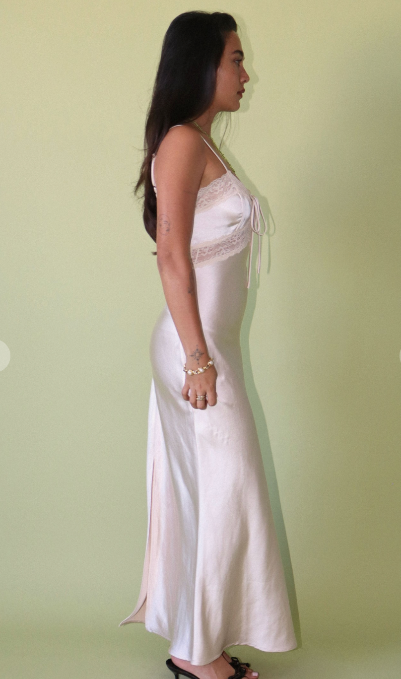 Cream colored heavy satin dress with lace bodice. Adjustable spaghetti straps. This is perfect for your next date night or romantic holiday evening.
