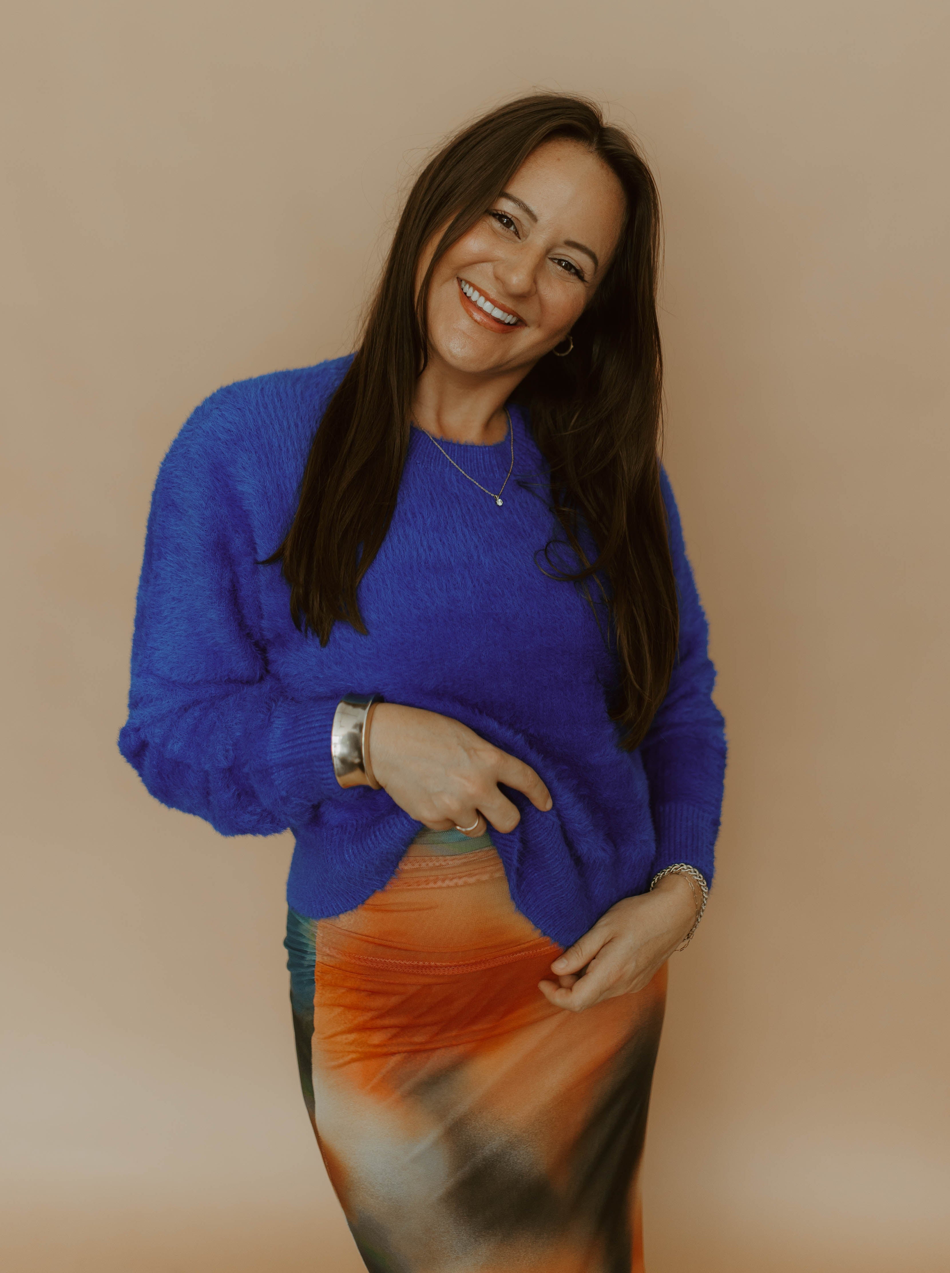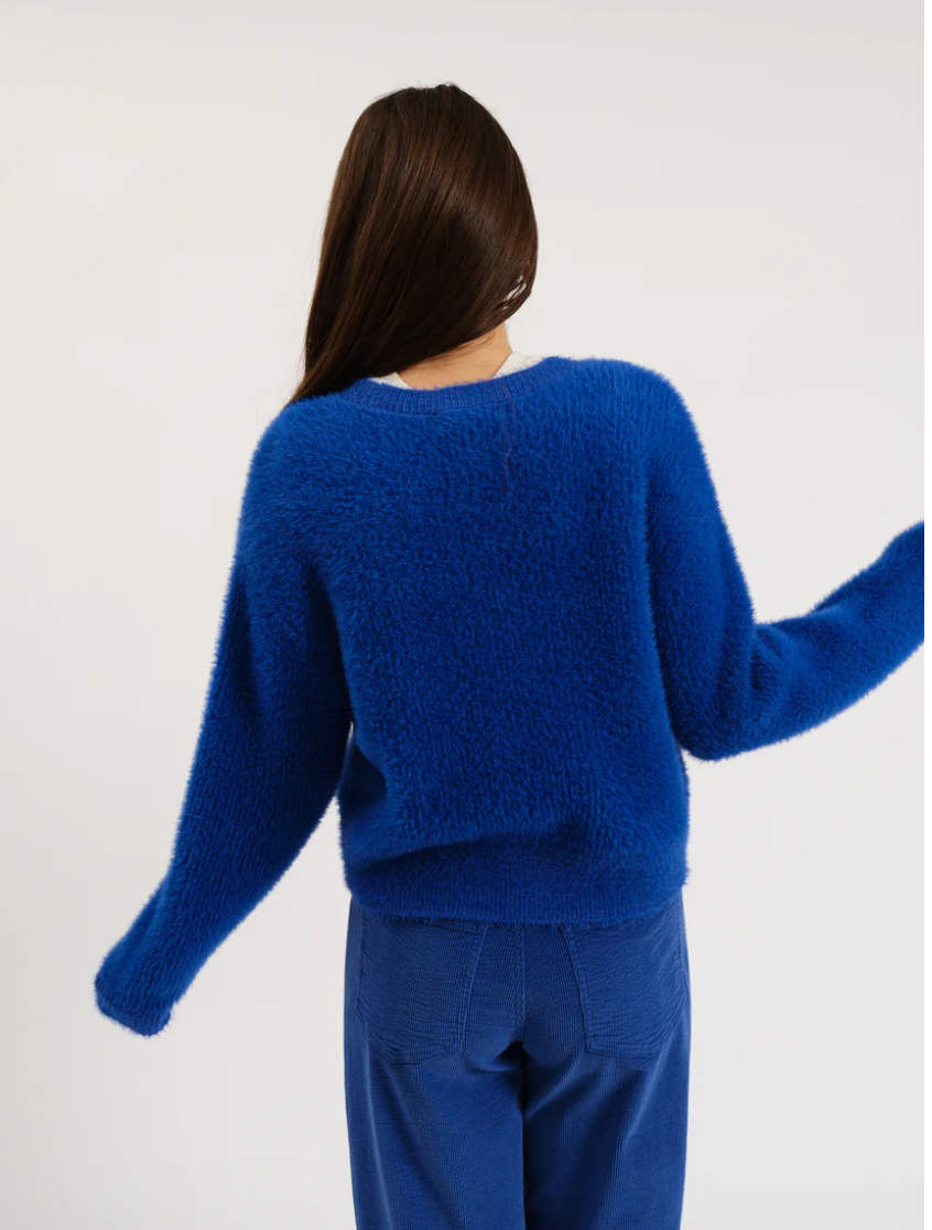 The Fuzz crewneck sweater is a vibrant cobalt blue sweater in a soft, fuzzy eyelash knit.