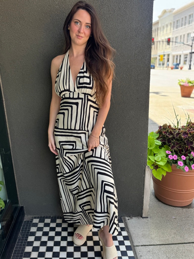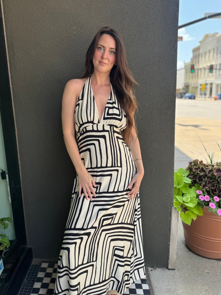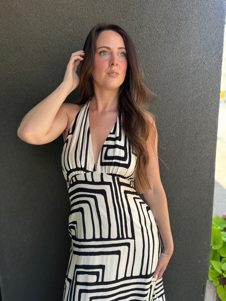 Black and cream geometric printed halter dress. Light-weight breathable fabric perfect for those summer days and night!