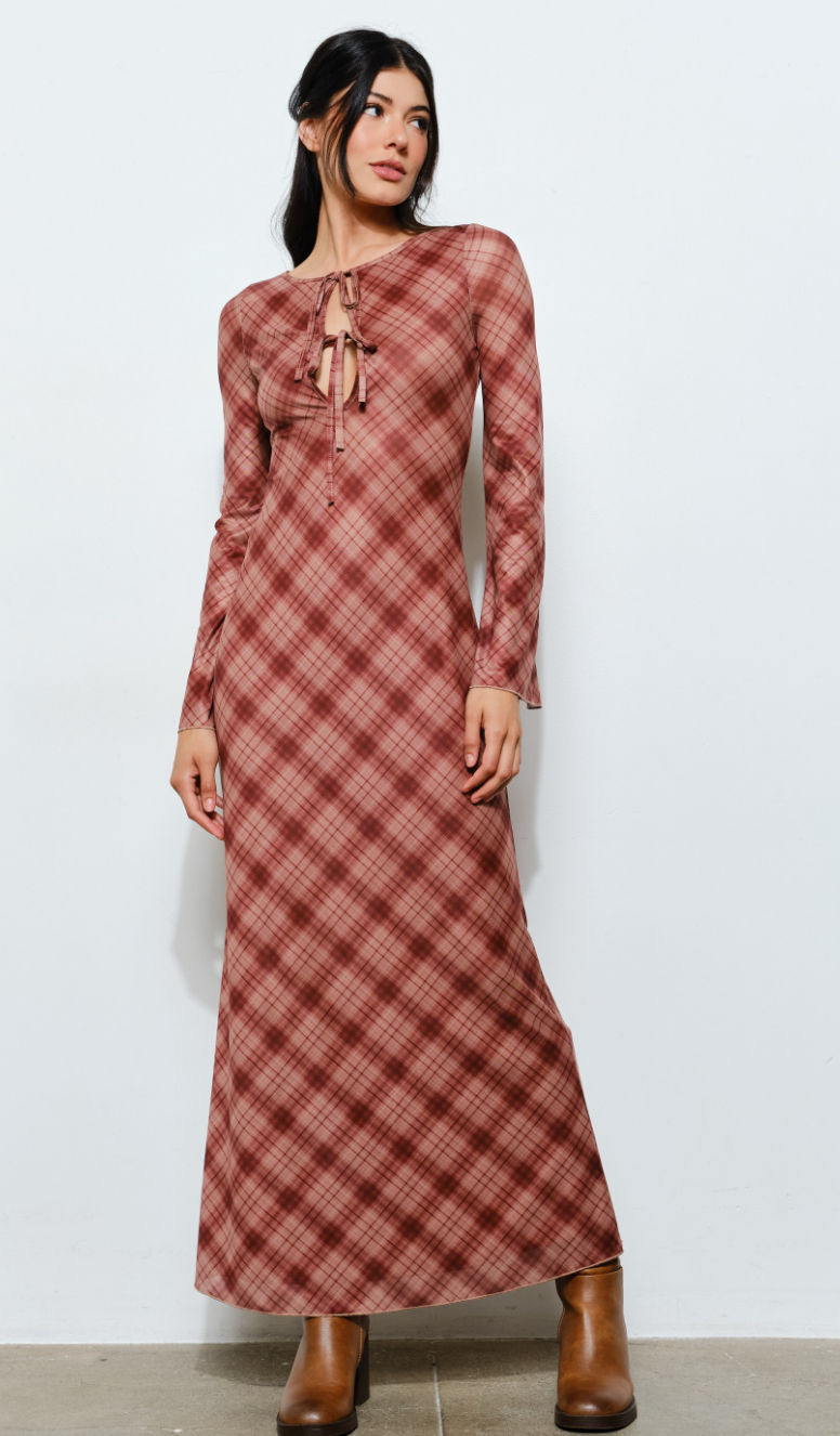 Long bell sleeve plaid mesh maxi dress with keyhole neckline featuring two bow ties. This dress is rust colored, somewhere between a dark red and brown! Pair this dress with our Mallard Rustic Sweater for an ultra-fall cozy chic look! This dress is perfect for that fall wedding on your calendar or your Thanksgiving plans!