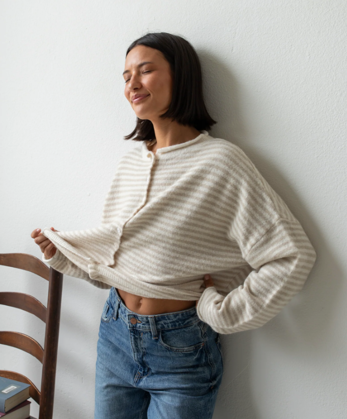 Your favorite Piper Cardigan in a mini striped pattern and available in the season's hottest colors!! So versatile in style, can be adapted to fit into anyone's wardrobe. Oversized, drop shoulder fit.